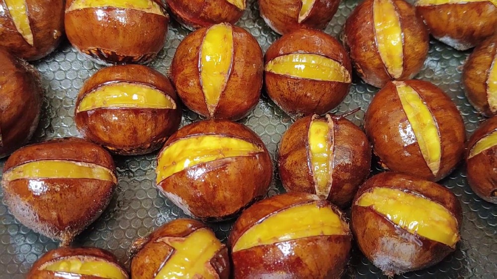 約5分鐘后,栗子表皮開始微微發(fā)亮、變色。