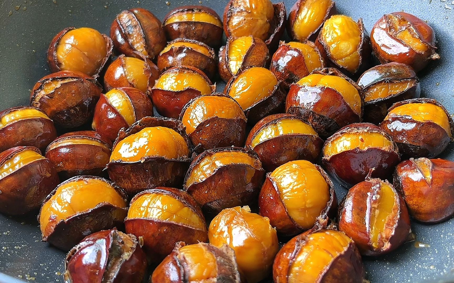 當糖色均勻裹在栗子表面時,整個鍋中會彌漫出濃郁的焦糖香味。